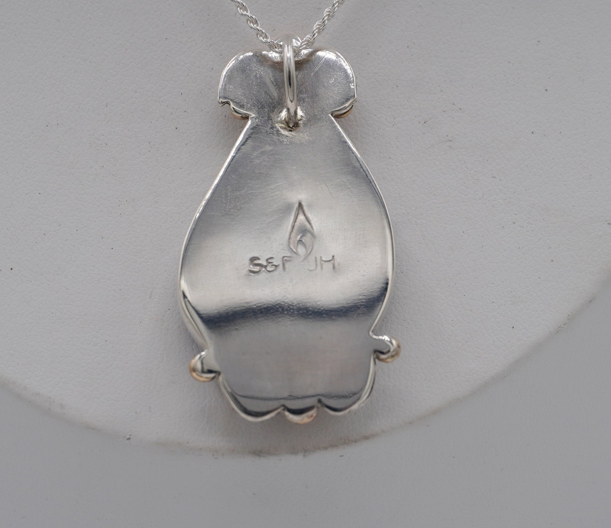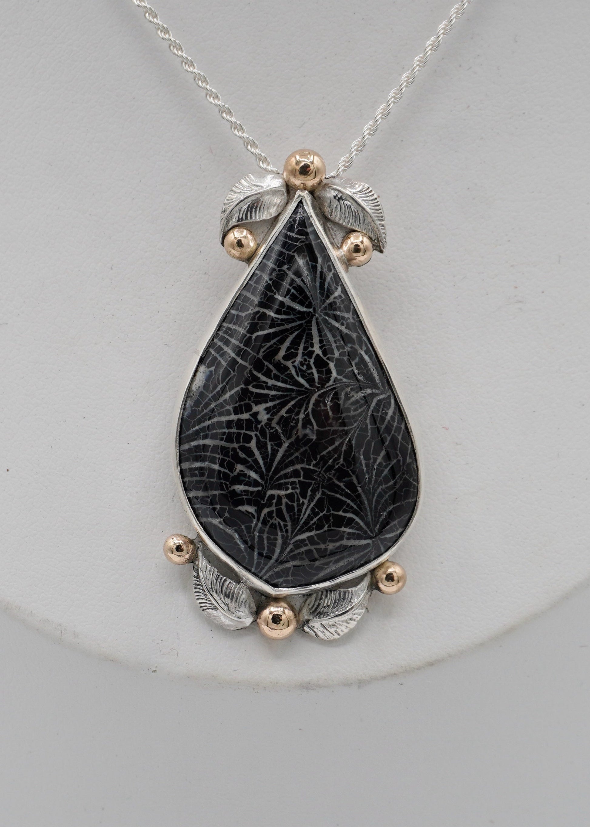 The unique pattern of this Indonesian Black Fossil Coral cabochon is reminiscent of fireworks in a night sky! Three dimensional Sterling Silver leaves and 10 K Gold accents embellish the centerpiece stone. A Sterling French Rope chain suspends the pendant from a hidden bail on the back of the setting, making this uniquely cut stone a truly special piece.