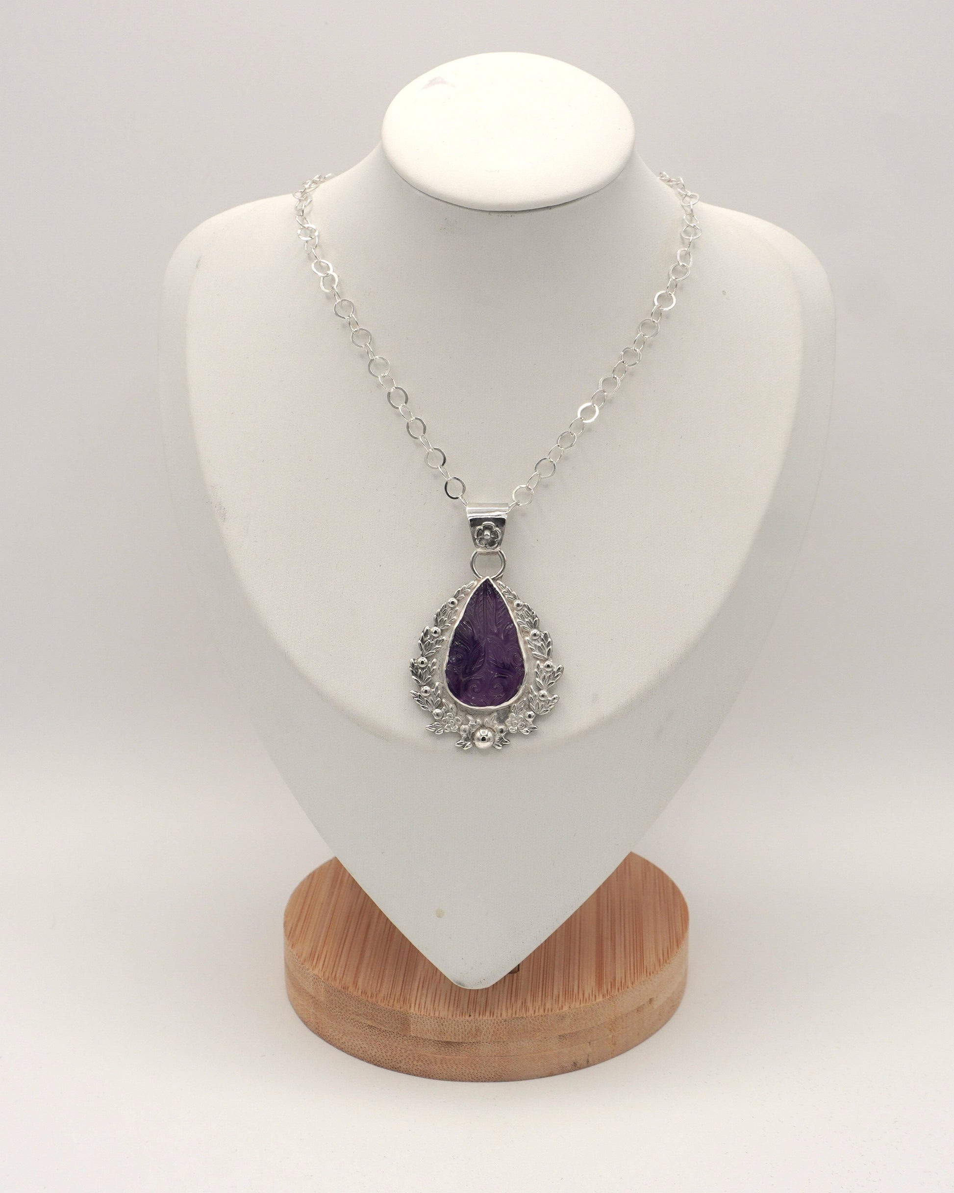 This stunning one-of-a-kind Amethyst teardrop cabochon is embellished with leafy vines and flowers. A backplate window highlights the intricate carved pattern and color variegation within the stone. A custom bail with a matching floral charm completes the look.