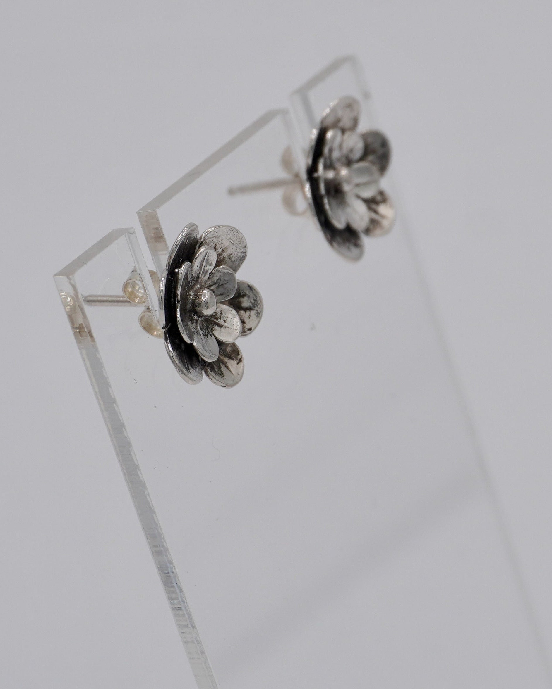 These sterling silver flower earrings feature a double-layer 3-D design with a lightly oxidized finish to make the details pop. They are on sterling posts with sterling butterfly earring backs.