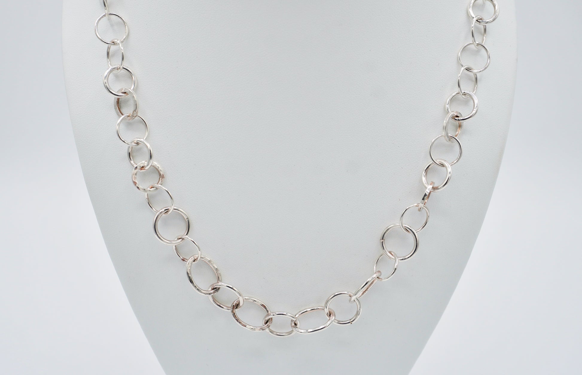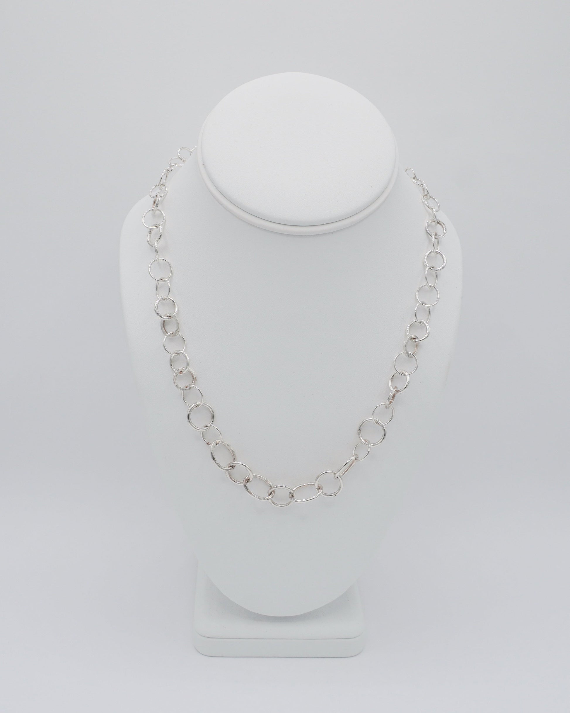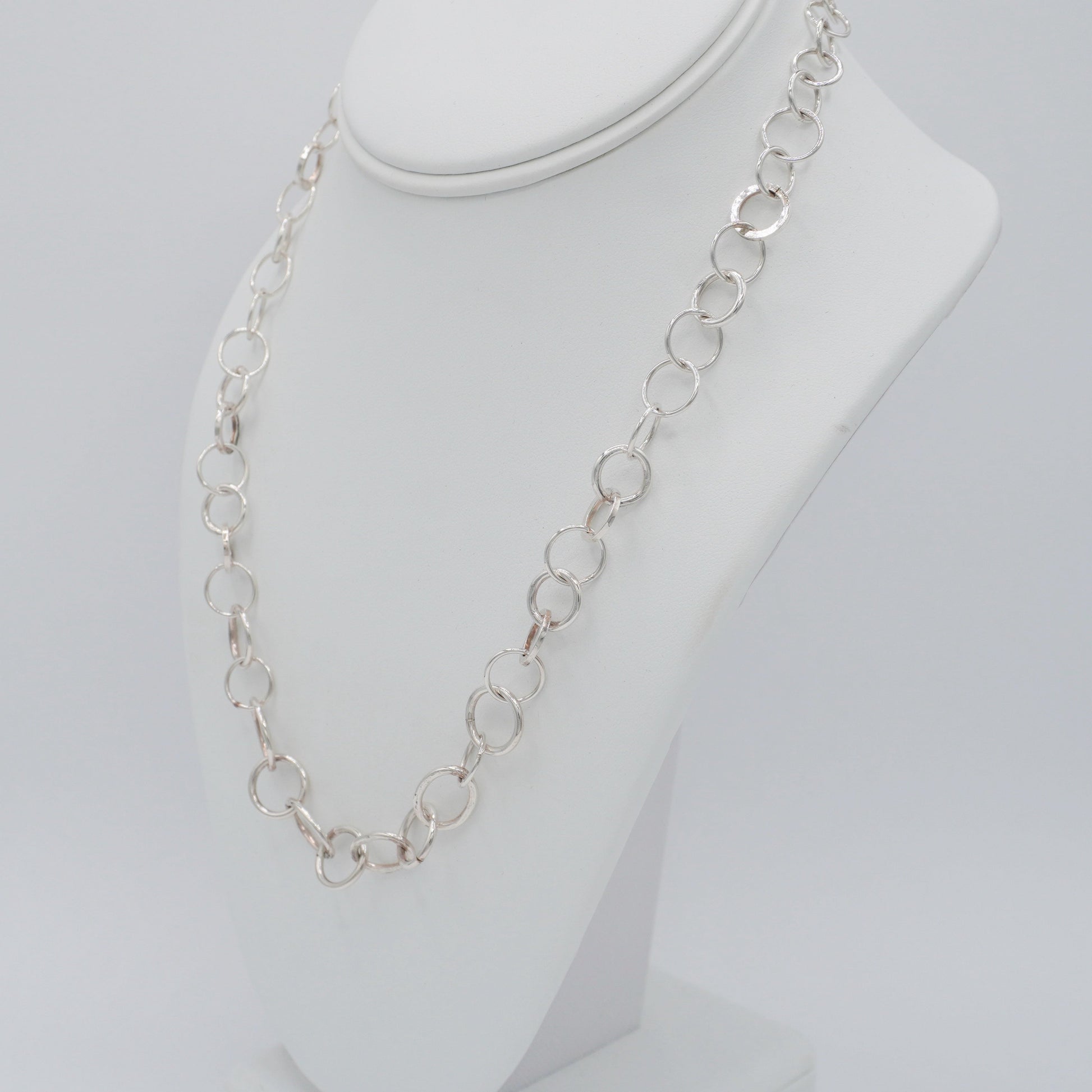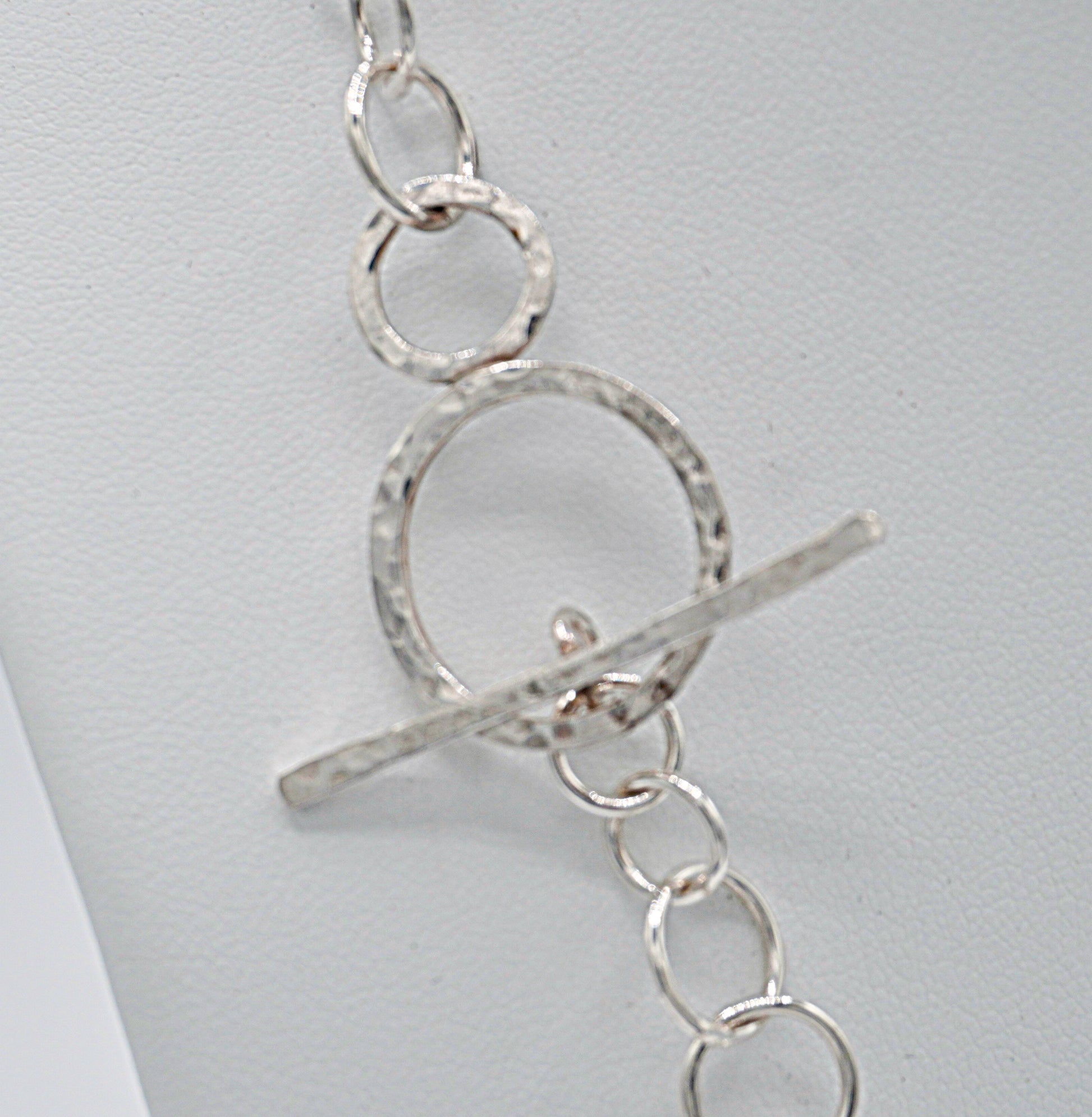 A variety of hand-made round and oval links, some smooth and others hammered for texture, combine to create a statement necklace. The toggle clasp, also hand made, can be worn traditionally in back, or brought to the side for visual interest.