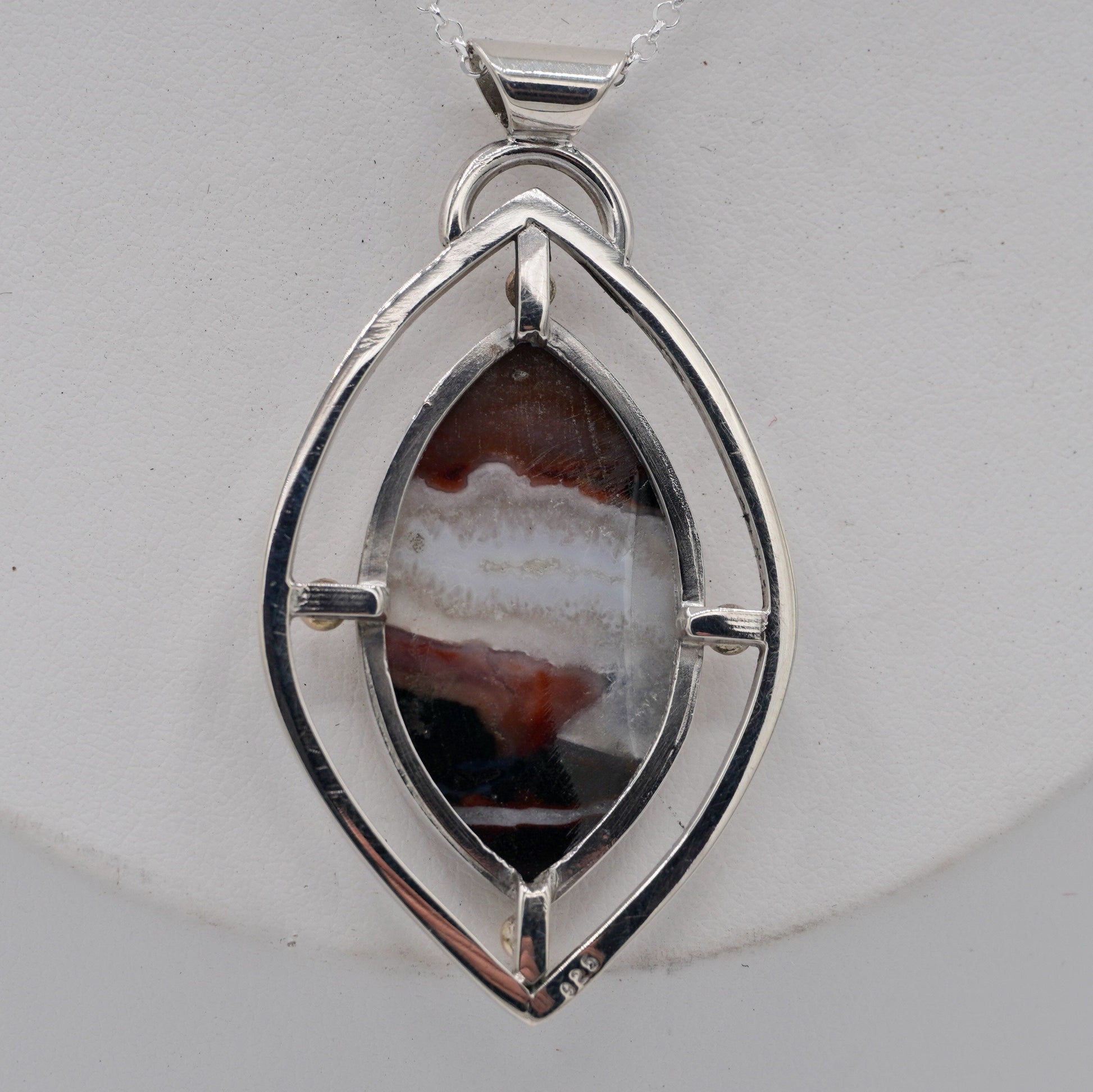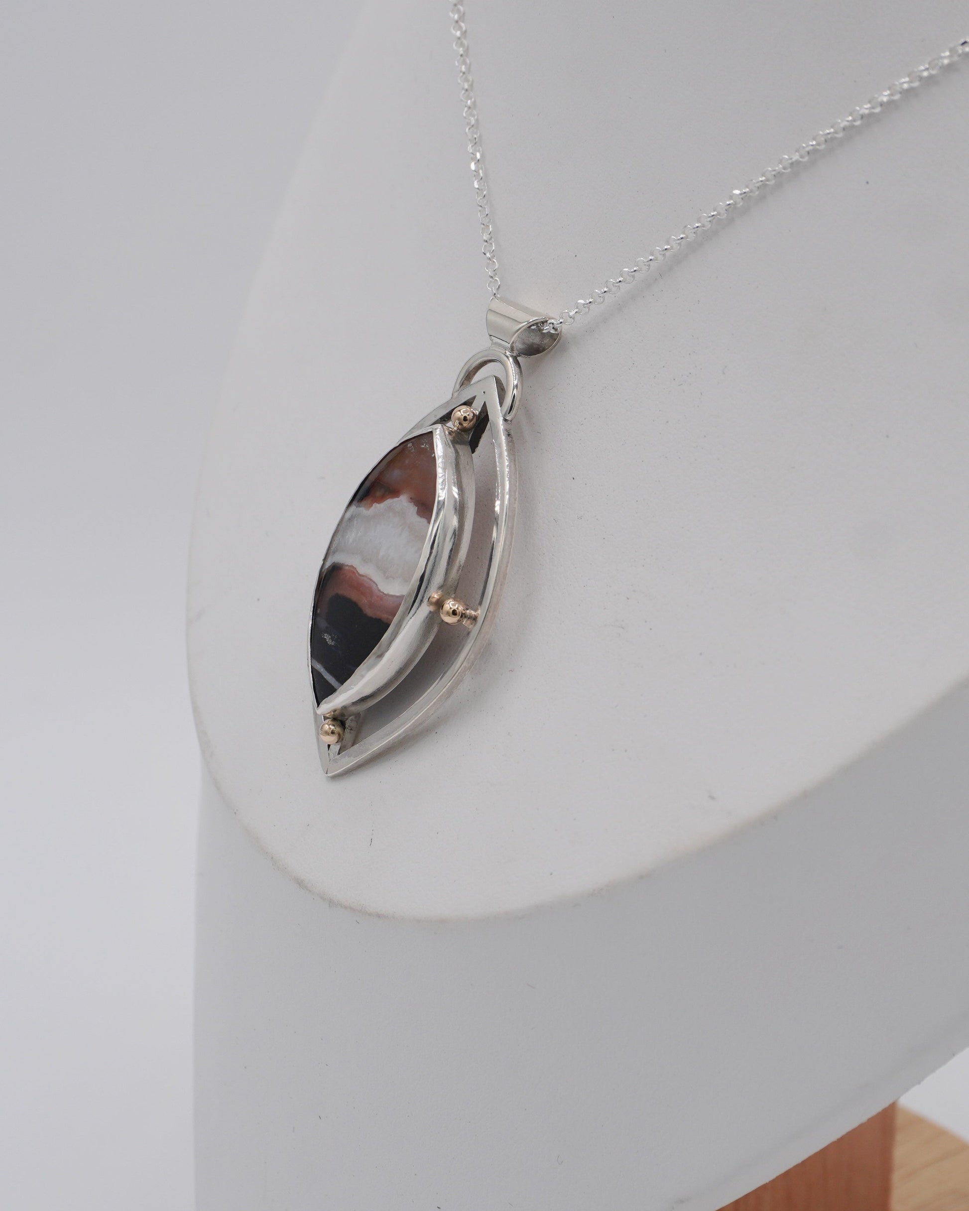 This striking Tuxedo Agate is surrounded by a Sterling Silver frame with 10K Gold accents appearing to suspend it within. A diamond cut chain creates an elegant statement piece.
