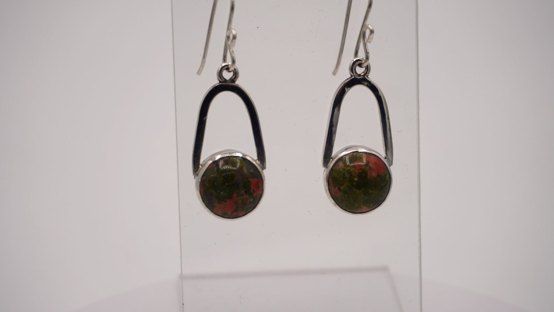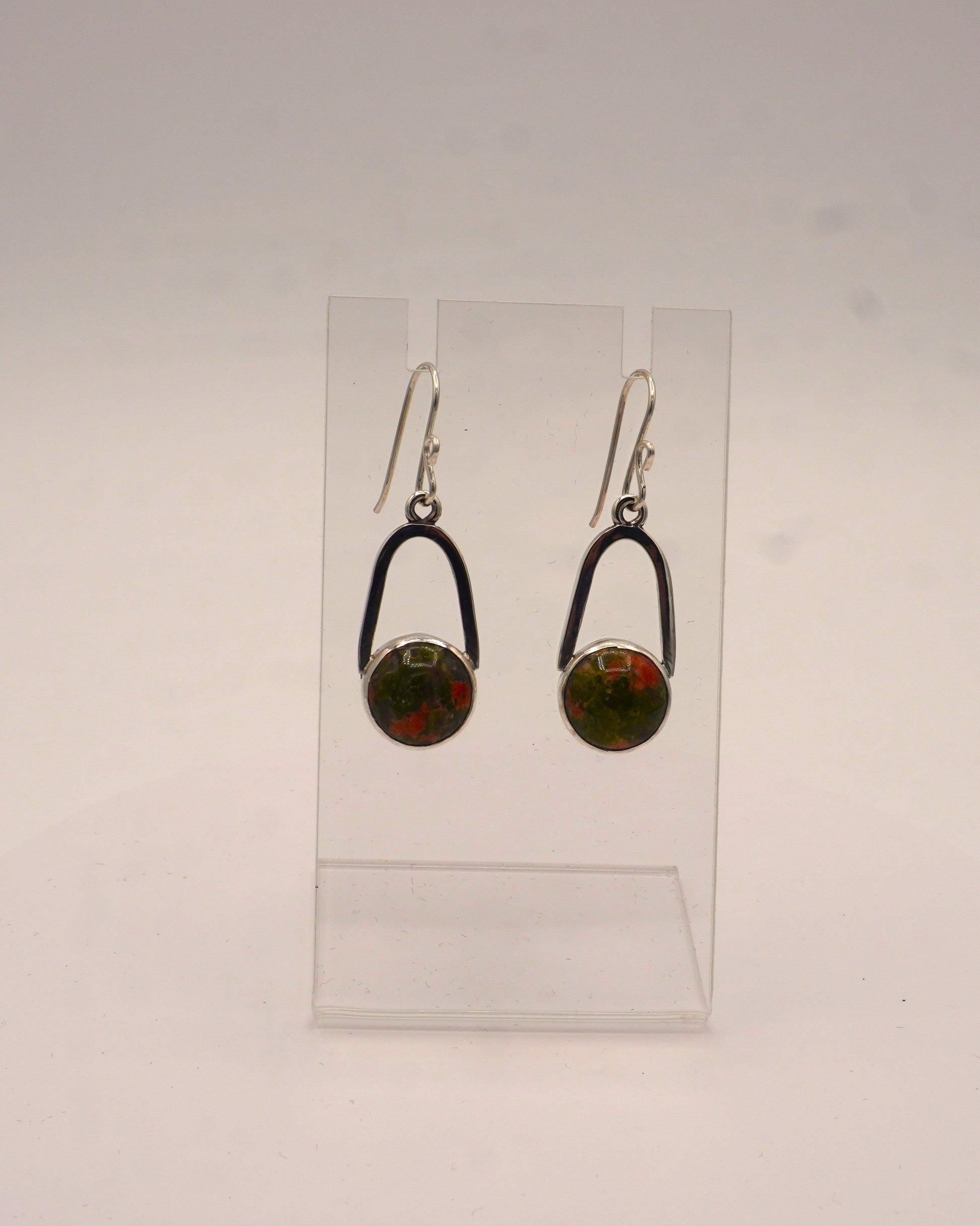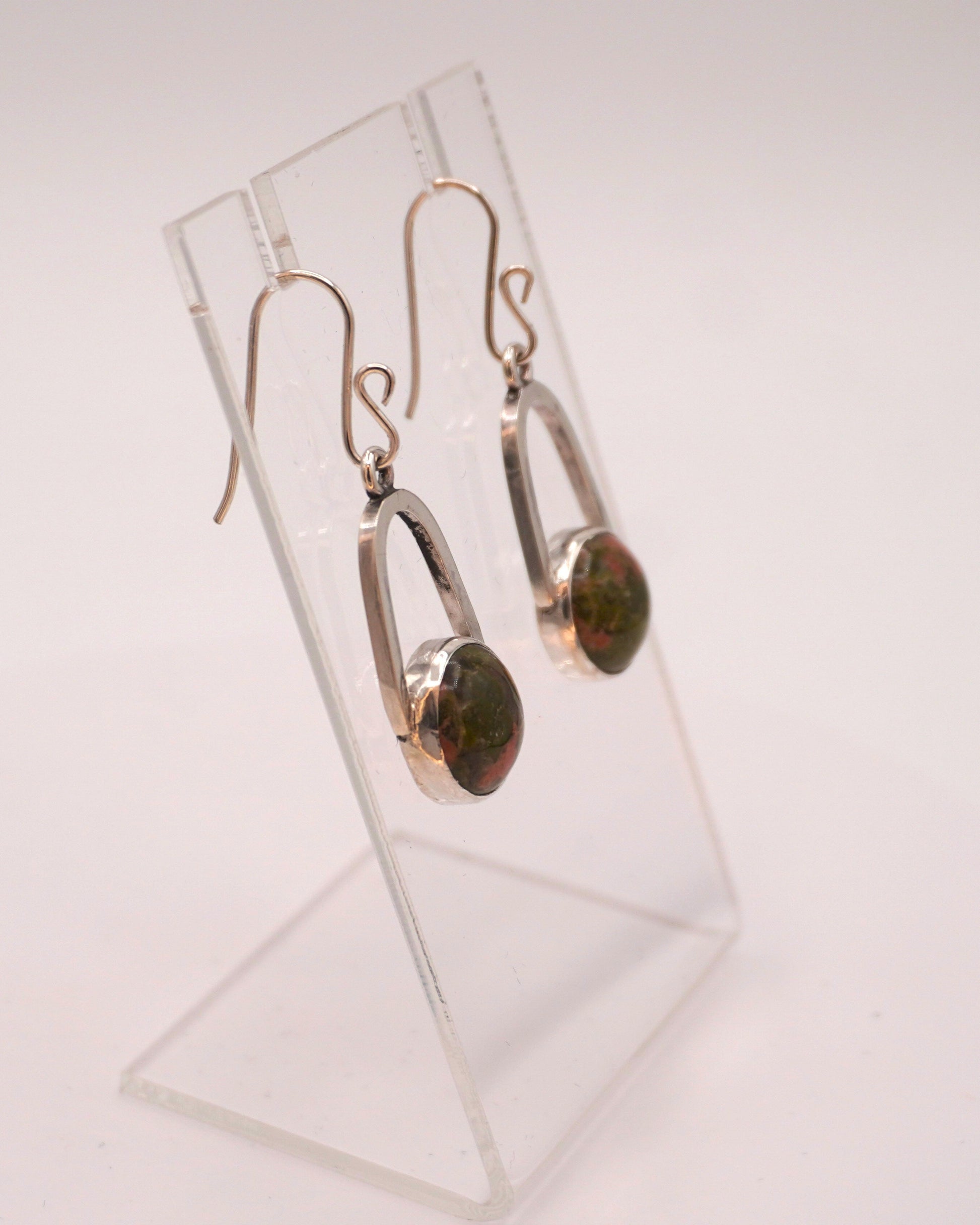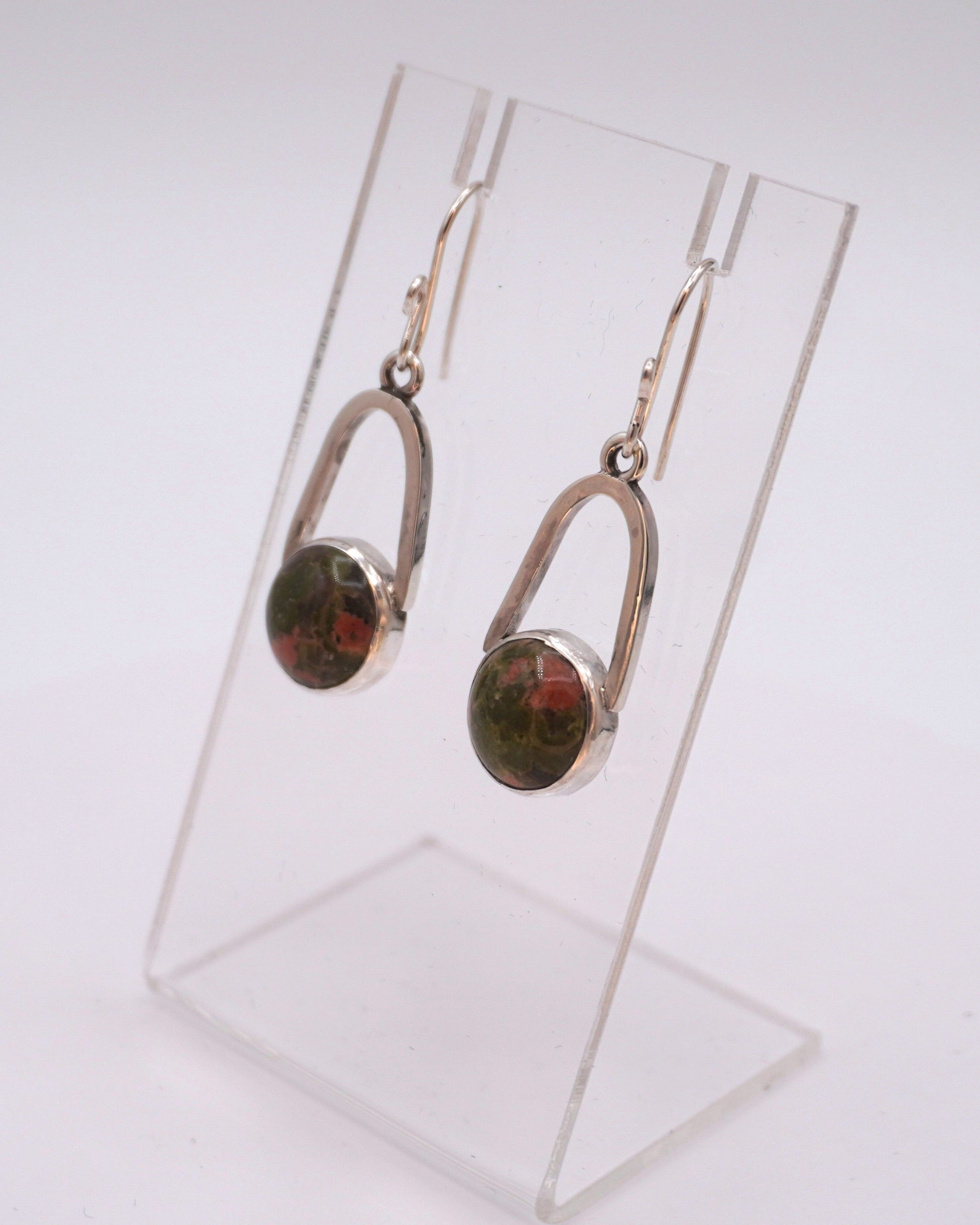 The unique green and coral colors of unakite cabochons are suspended by "wishbones" of sterling silver. A beehive pattern is embossed on the backs of the settings for hidden interest, and an extra flourish adorns the handmade French Hook ear wires.